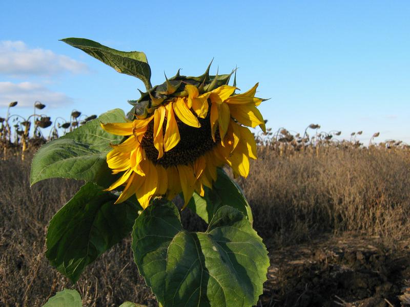 Тормознутый подсолнух на фоне позора наших аграриев. Такие неубранные поля видел не один раз.