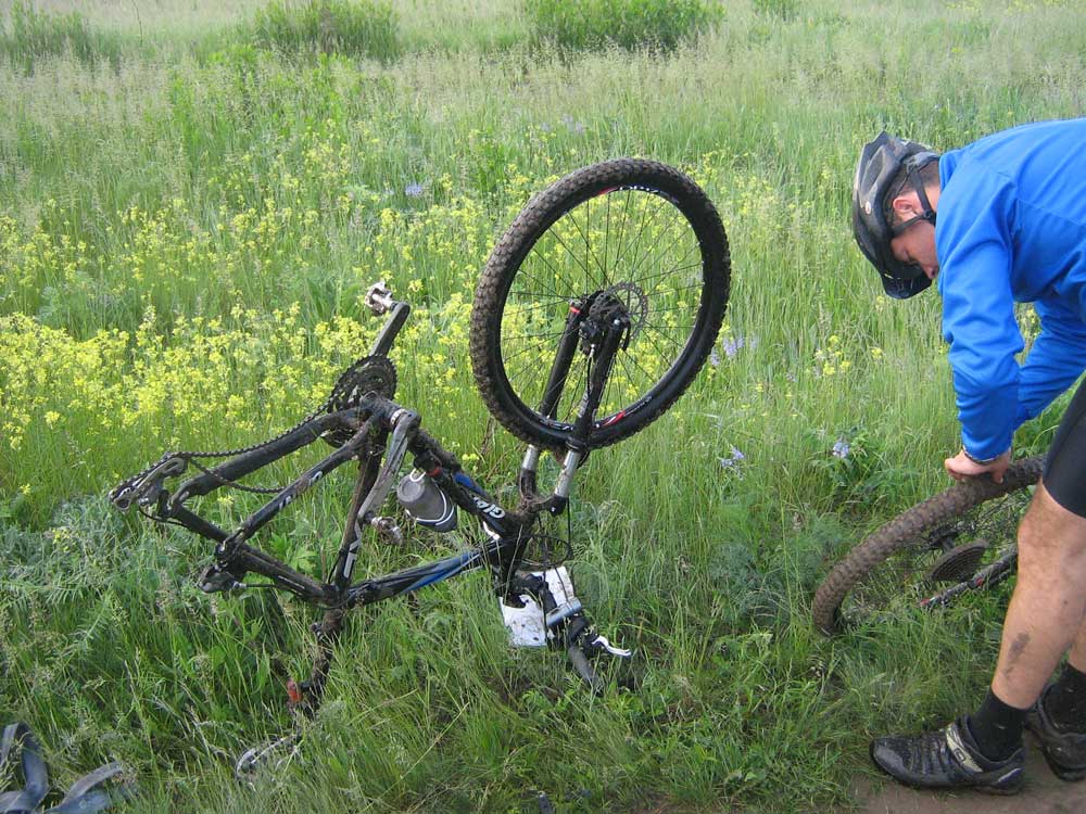 . Расстелен матрас, место для костра, валяется какая-то посуда, на ветках развешаны какие-то элитные шмотки и даже пристроено зеркало, по-видимому для утреннего макияжа. Почесав репу и не найдя красного треугольника контрольного пункта мужественно решаю возвратиться назад. Под лай щенка вылезаю обратно на тропу вдоль леса и еду по ней в сторону Метро. Через некоторое время соображаю, что заехал уже слишком далеко – разворачиваюсь и еду назад. И вот ура – секретная тропинка находится, а вслед за ней находится и неуловимый 11-й КП. Во время скитаний по чаще окончательно открутилась гайка на планшете с картой и он благополучно отвалился. Поэтому последние два КП брал с планшетом подмышкой.12-й КП находится без проблем и вот она – финишная прямая, идущая на подъем! Ворочая на колесах килограммы чернозема финиширую со скоростью бешеной черепахи! Ура добрался!